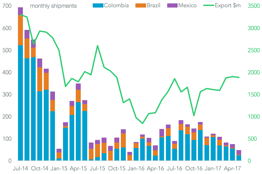 Panjiva analysis of food exports to Venezuela from Brazil, Colombia and Mexico shows shipments in May were 67.1% lower than a year earlier. They also dropped 37.3% sequentially, with the result that imports hit their lowest since January 2015 and hence the second lowest since in over a decade.