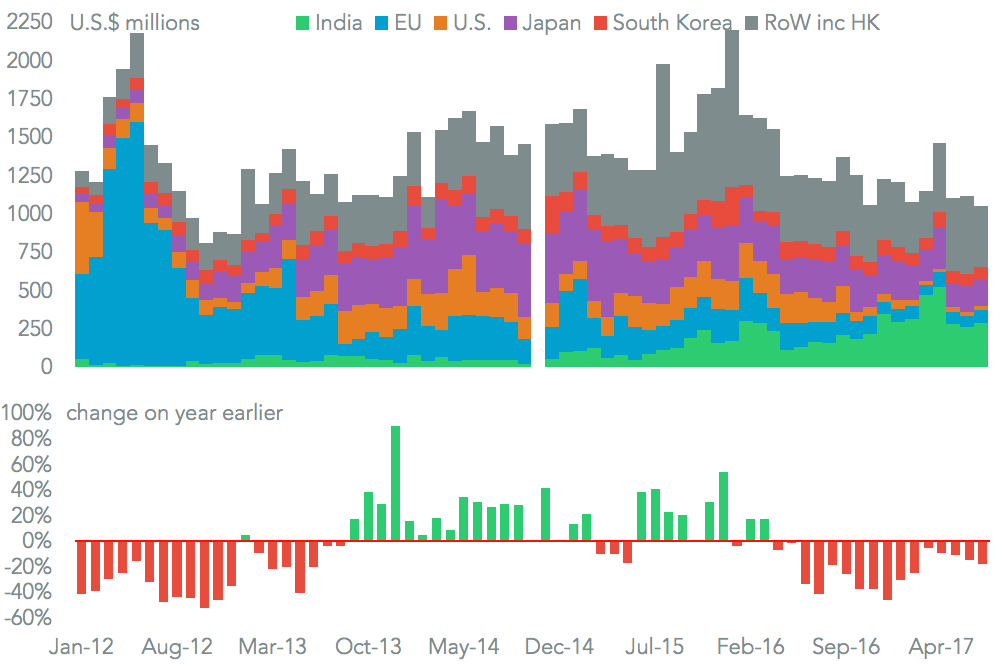 That has had the most significant impact on Chinese manufacturers, which have had to find new markets. They’ve had limited success after 16 straight months of falling exports, Panjiva data shows. A key target market for exporters, led by Trina Solar, including has been India. Exports to India from China in the 12 months to July 31 were 6.7x their levels of three years earlier.