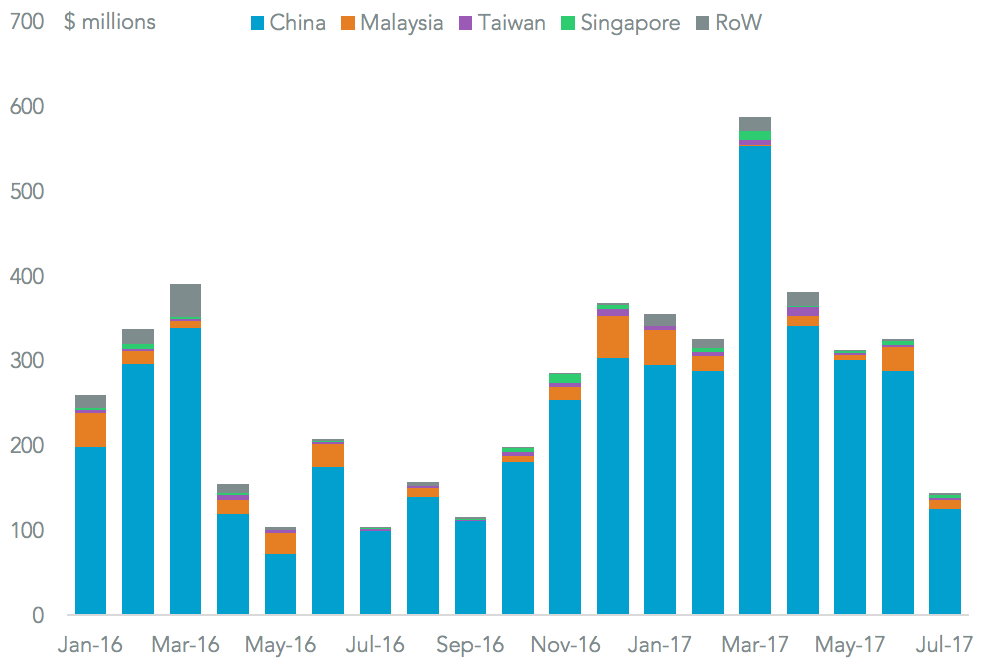 That growth has continued recently, with Indian imports from China rising 68.7% year-to-date vs. the same period a year earlier. That has resulted in Chinese exports squeezing other producers out of the market – total imports only increased 56.1%, while those from Malaysia fell 10.4%.