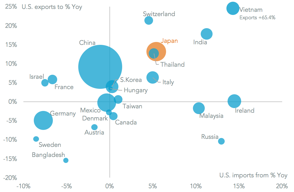 The accusation echoes that made by Peter Navarro with regards to Germany, as discussed in Panjiva research of January 31 and follows the U.S. withdrawal from the Trans-Pacific Partnership which includes Japan. This may be the first salvo in the U.S. administration’s negotiation of a bilateral deal with Japan.