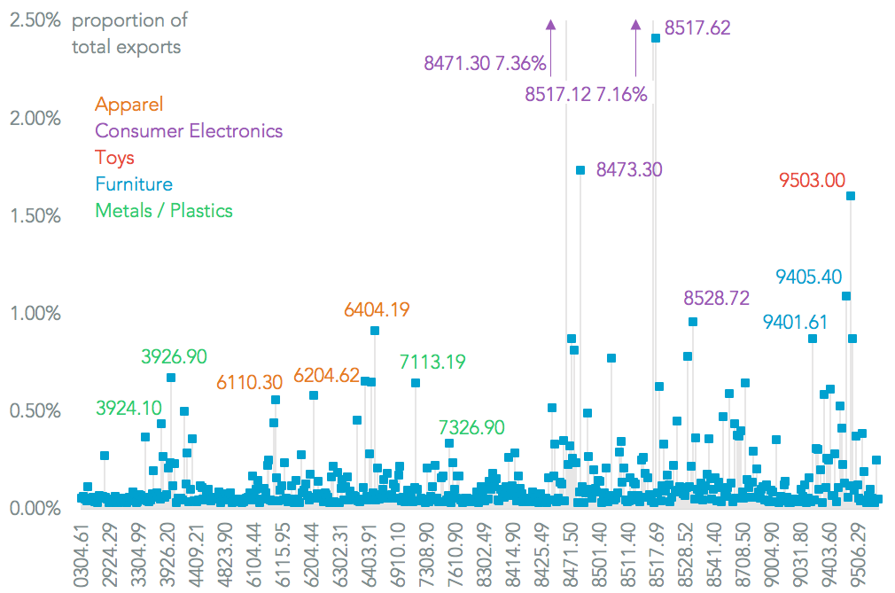 Assuming a case is pursued, and assuming it find trade policy actions – in the form of broad tariffs – should be made it is nonetheless difficult to find easy, significant export lines that could be actioned upon. Panjiva analysis of the top 500 export lines from China to the U.S., are heavily skewed towards consumer goods, with actions potentially coming just ahead of the traditional holiday shopping season.