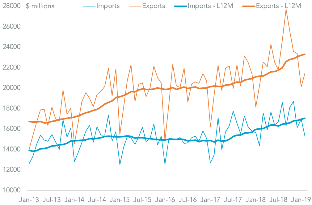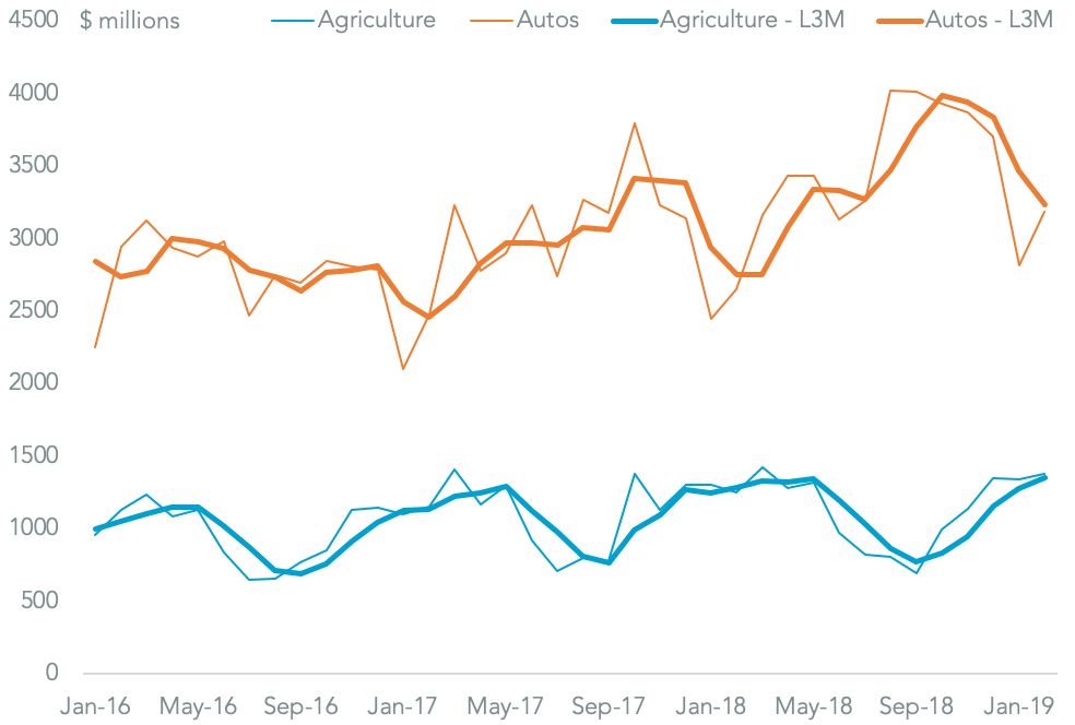Shipments of agricultural products can ill-afford disruptions given Mexican exports to the U.S. by truck only increased by 0.5% year over year in the 12 months to Feb. 28 to reach $13.5 billion, though that has accelerated to 5.5% in the three months to Feb. 28. Automotive industry exports meanwhile soared 25.6% in the past 12 months, to reach $46.0 billion, and 17.7% in the last three months.