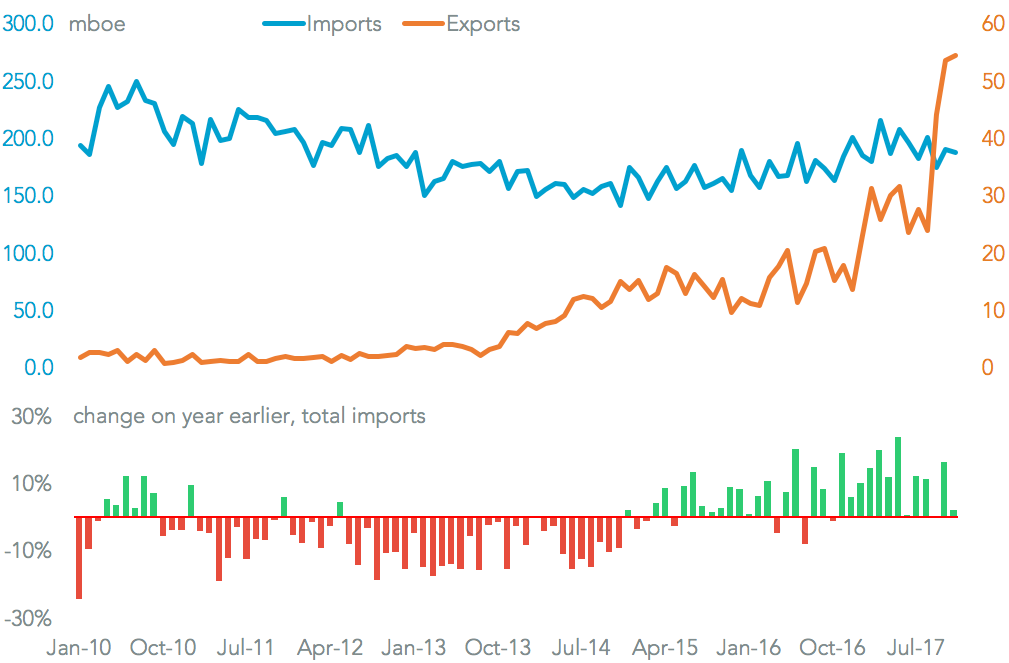Trade activity in the U.S. oil sector shows the country took a marked step towards energy independence in the past three months. That came as the OPEC oil cartel decided to continue its current cutbacks through the end of 2018, opening the opportunity for increased U.S. oil exports to come – though the window may be limited if crude inventories drop, Bloomberg reports. There may also be temporary opportunities, for example resulting from the outage of the critical Forties pipeline in the U.K. by Ineos.
