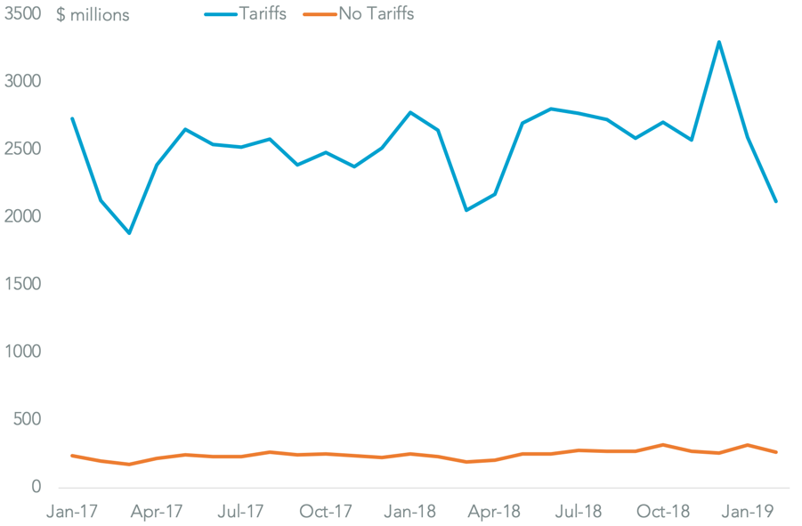 Panjiva analysis shows that imports of the products covered by the so-called “list three” products, worth around $200 billion annually, fell 7.5% year over year in the three months to Feb. 28 and by 25.9% in the month of February alone. An increase in duties would likely accelerate that decline assuming consumer prices are not increased.