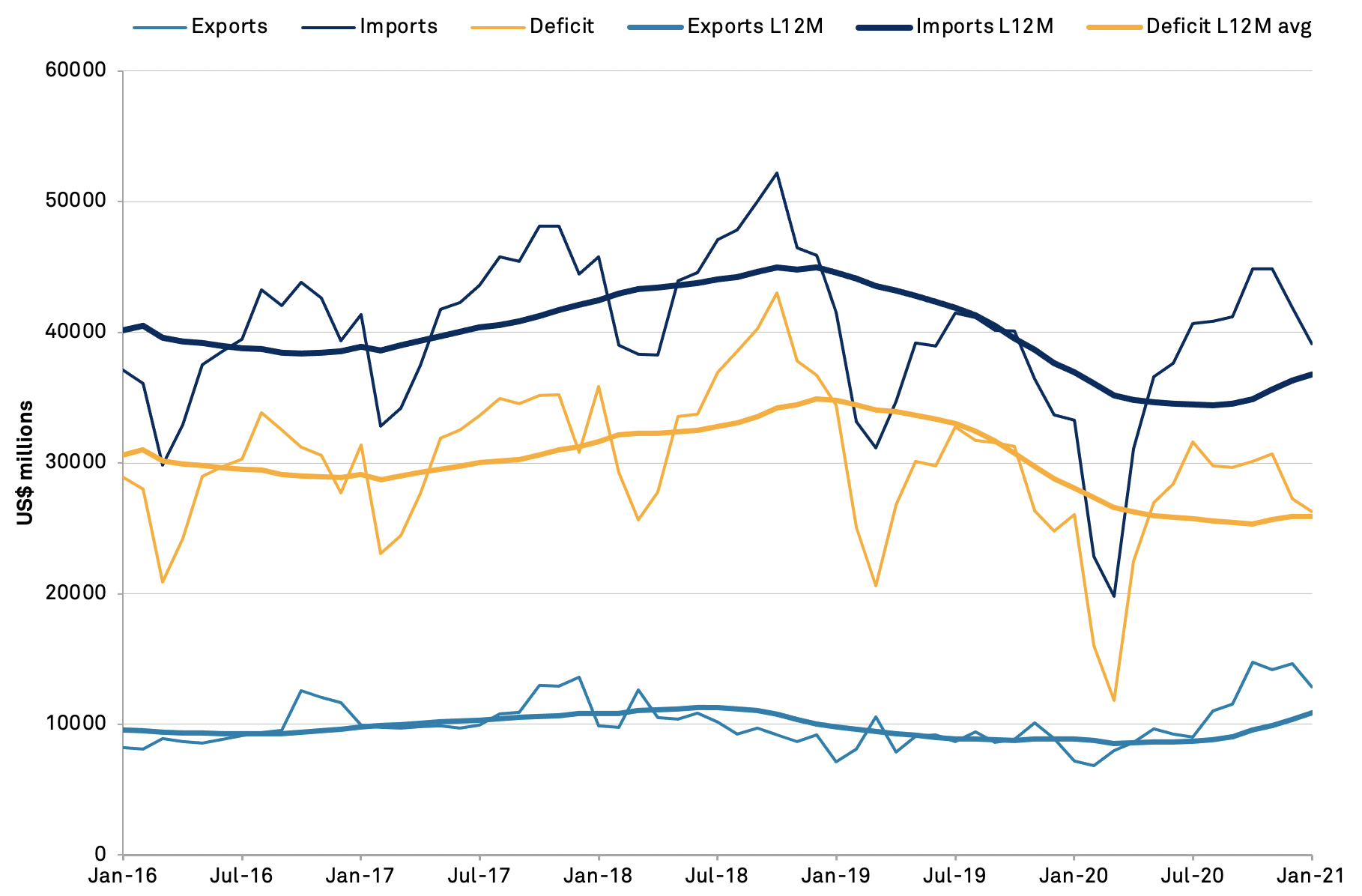 U.S. international trade activity fell by 1.7% year over year in January, Panjiva’s analysis of official data shows, marking a 17th straight monthly decline in goods and services combined. That was nonetheless the slowest rate of decline since Dec. 2019 resulting from an accelerating surge in imports of goods which climbed 8.5% higher as a result of strong consumer demand, as discussed in Panjiva’s Feb. 6 research.