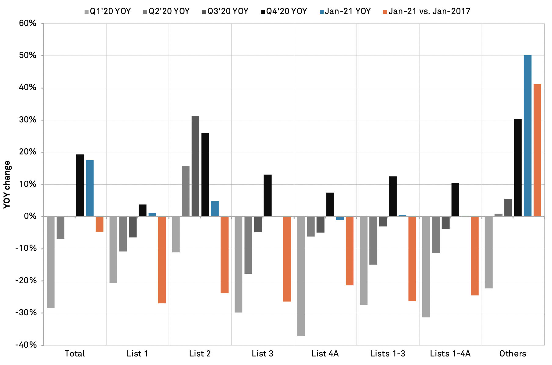 The increase in imports and the resulting goods deficit with China reflects the maturity of the tariffs on imports from China. Panjiva’s analysis shows that imports of products covered by lists 1, 2 and 3 where tariffs were applied at a 25% rate in waves from July 2018 inched 0.5% higher year over year in January. That included a 4.9% increase in list 2 products, many of which have received exemptions including those of medical supplies which will lose their exemption from March.