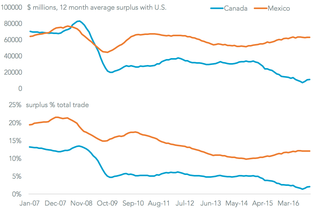 There are two major areas where Prime Minister Trudeau may have had a trump card (as it were) to play. First is his reference that “35 U.S. states list Canada as their largest export market”. Adding to this, Canada’s trade surplus with the U.S. has fallen steadily over time, and was just 2.1% of U.S.-Canada total trade in 2016 according to Panjiva data for U.S. imports and exports. That compares to 13.2% in 2006 and Mexico’s current 12.0%. A recent increase in the Canadian surplus has been due to oil price rises rather than increased merchandise exports.