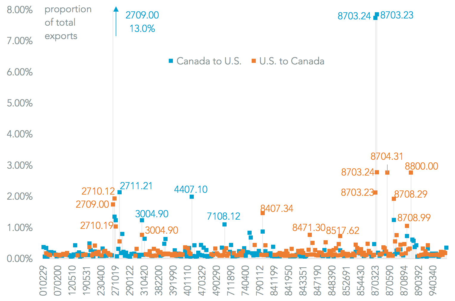 The second area is that Canada’s exports can be characterized more as a raw material supplier than as a workshop, which is the case with Mexico. The main manufactured product export areas are in autos (HS 87) where the two countries are co-dependent, while materials including energy (HS 27), wood (HS 44) and precious metals (HS 71) were the other major export lines in 2016. It is also a vital client country for major U.S. export sectors including aerospace (HS 88), refined energy products, capital goods (HS 84) and electronics (HS 85).