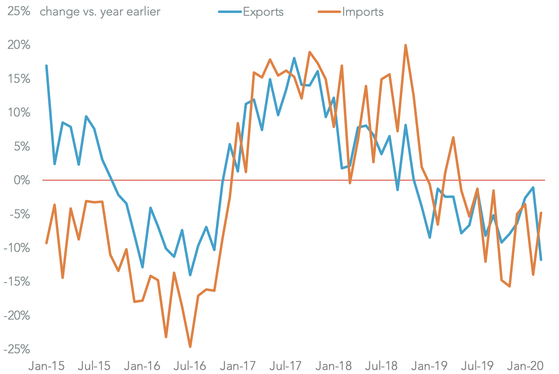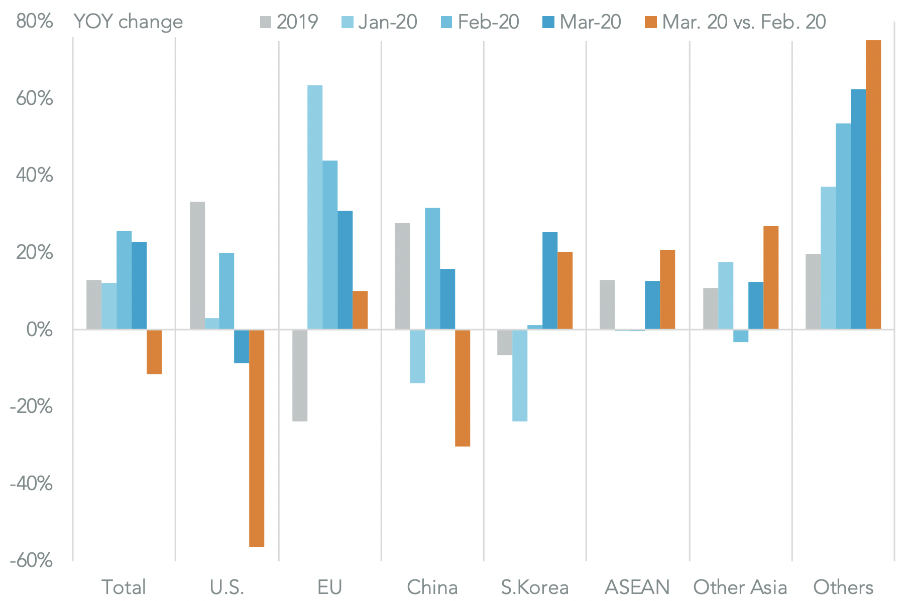 In absolute terms that meant exports to the U.S. fell by 56.4% sequentially in March. The differentiation may reflect the relative speed of government and healthcare providers’ responses to the coronavirus outbreak.