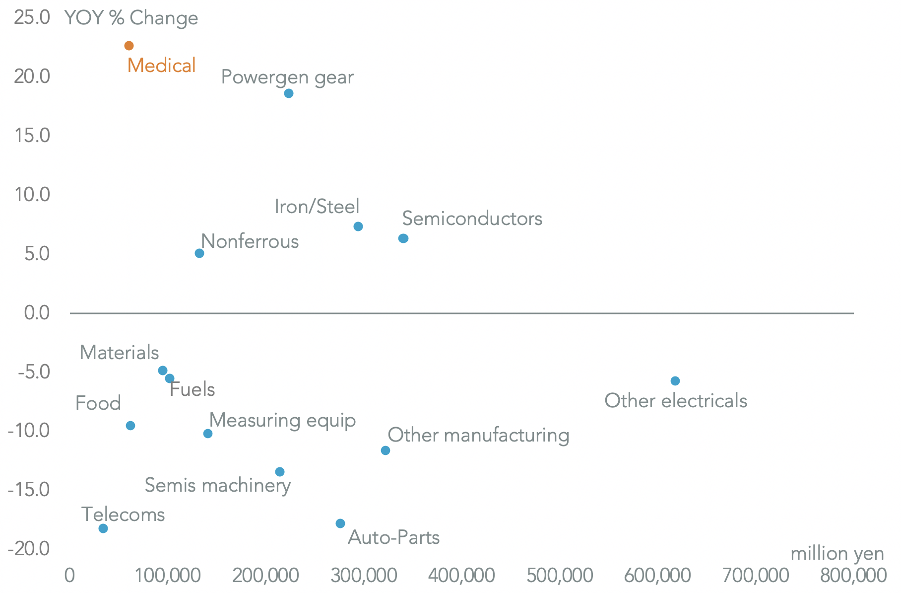 Consumer and capital goods meanwhile generally saw a decline with semiconductor manufacturing machinery exports falling by 13.5% while exports of cars and parts fell by 13.9% and 17.9% respectively. The latter suggests the automakers see little respite in declining demand.