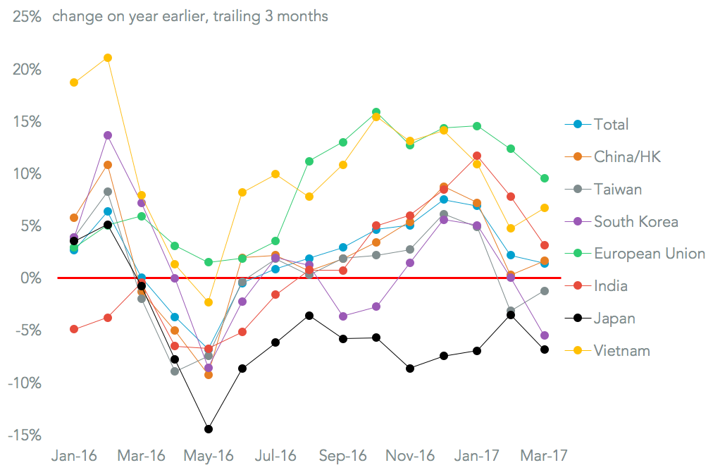 Shipments from Vietnam, which is increasingly a production hub for industries ranging from renewables to telecoms, increased 22.2%. The main loser was South Korea, which saw a second month of declines with 10.6% fewer shipments. That contrasts with its strong global export performance.
