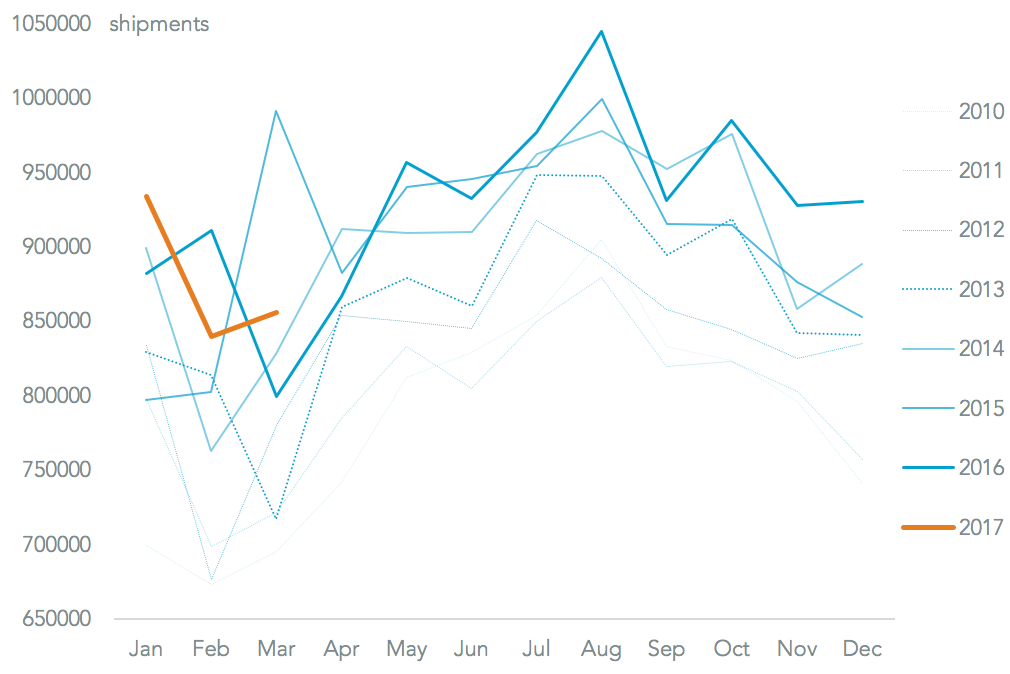 U.S. import growth returned with a bang in March, with seaborne shipments rising 7.0% on a year earlier, Panjiva data shows. Despite a weak February result for imports, as discussed in Panjiva research of March 28, this meant the first quarter experienced a 1.4% rise in shipments. The March growth was the fastest since December’s 9.1% increase, though it was 13.7% below 2015’s level which included the aftermath of the west coast shipping strikes.