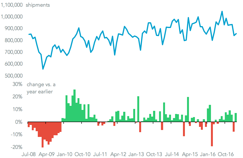 One item that will be particularly unwelcome to the Trump administration will be the rise in imports of autos and components. These increased 9.6% in shipment terms, the eighth straight month of growth and the fastest undisrupted rate since October 2014. Iron and steel imports also rallied, rising nearly 25.3%. That may cause the Commerce Department to take another look at the industry. Among consumer goods furnishings returned to growth, with a 19.8% rise while apparel extended its losing streak to a tenth month.