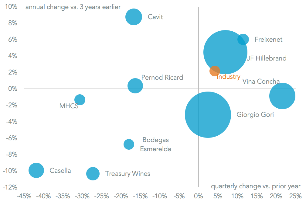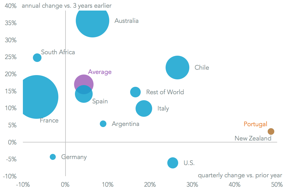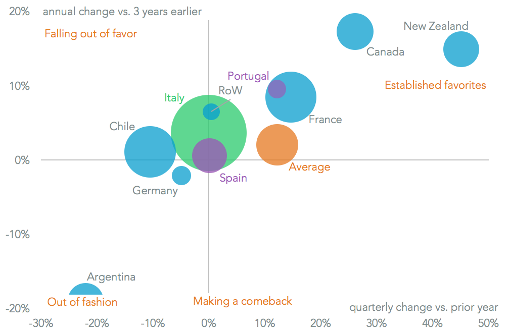 Chart segments U.S. imports of wine by country of origin. Horizontal axis shows change in past quarter on a year earlier, vertical axis is change in past 12 months vs. three years earlier. Bubble size indicates total imports by volume. Bubble color for legibility only. Source: Panjiva