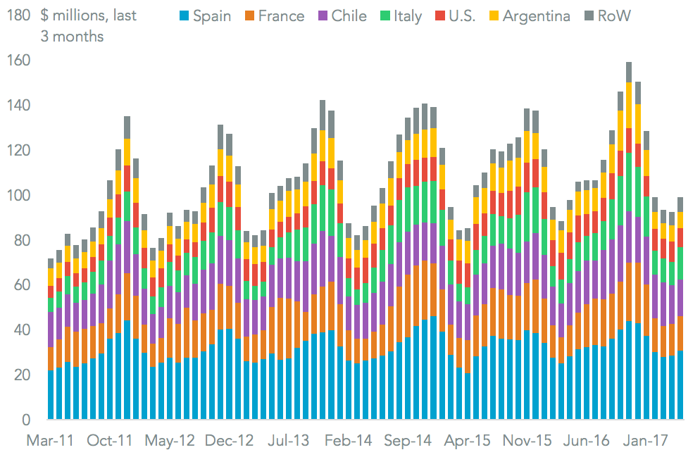 Chart segments Mexican imports of wine by country of origin on a trailing three month basis. Source: Panjiva