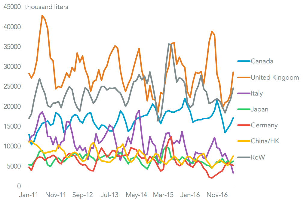 Chart segments U.S. exports of wine by destination country Source: Panjiva
