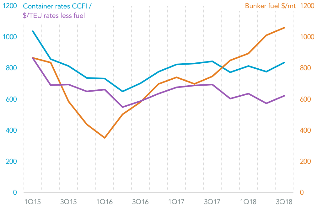 The rising fuel costs can be seen in a 43.1% rise in average bunker fuel costs for marine shipping in the third quarter vs. a year earlier and by 5.7% vs. the second quarter, S&P Global Platts data shows. In turn that has also caused a headache for container-lines as outlined in Panjiva research of October which led to a series of bunker-fuel surcharges and a 7.5% rise in container rates in the third quarter vs. the second quarter.