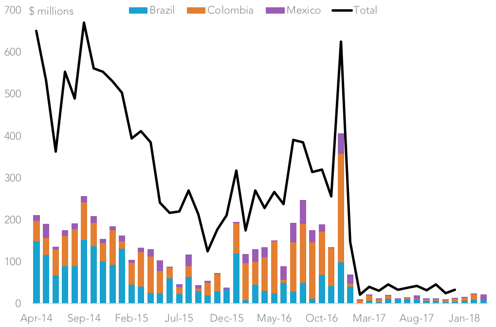 There have been some improvements in imports in the first quarter of 2018 with imports from Brazil up 62.1% sequentially (though still down 47.9% on a year earlier), 108% higher from Colombia (and 57.1% better than a year earlier) and a 8x rise in shipments from Mexico.