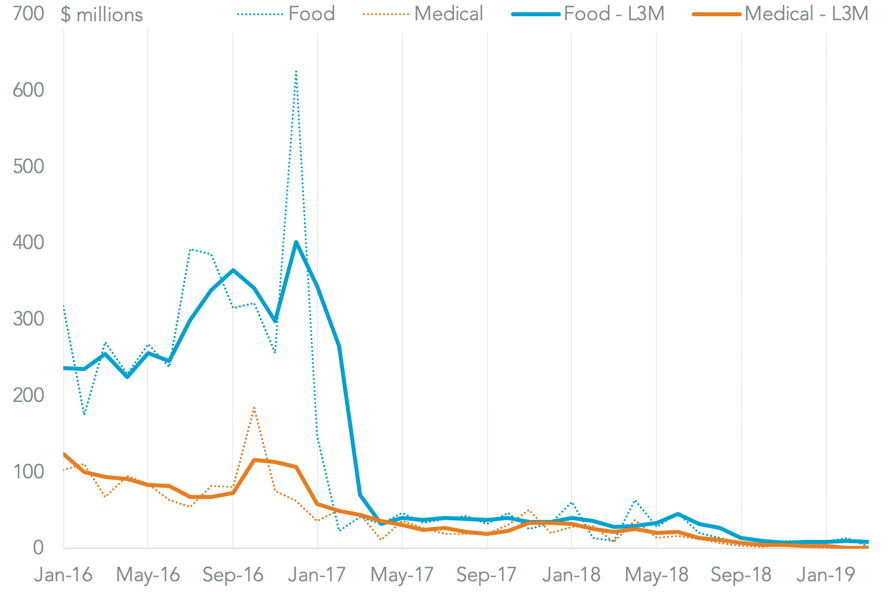Yet, those have already fallen to minimal levels as of March – there was a 71.4% drop in imports of food in 1Q 2019 compared to a year earlier to just $1.78 million in March, led by shipments from Mexico and Brazil. Meanwhile imports of medicines and other healthcare products fell 98.7% to just $40,000 in March with shipments led by supplies from Colombia.