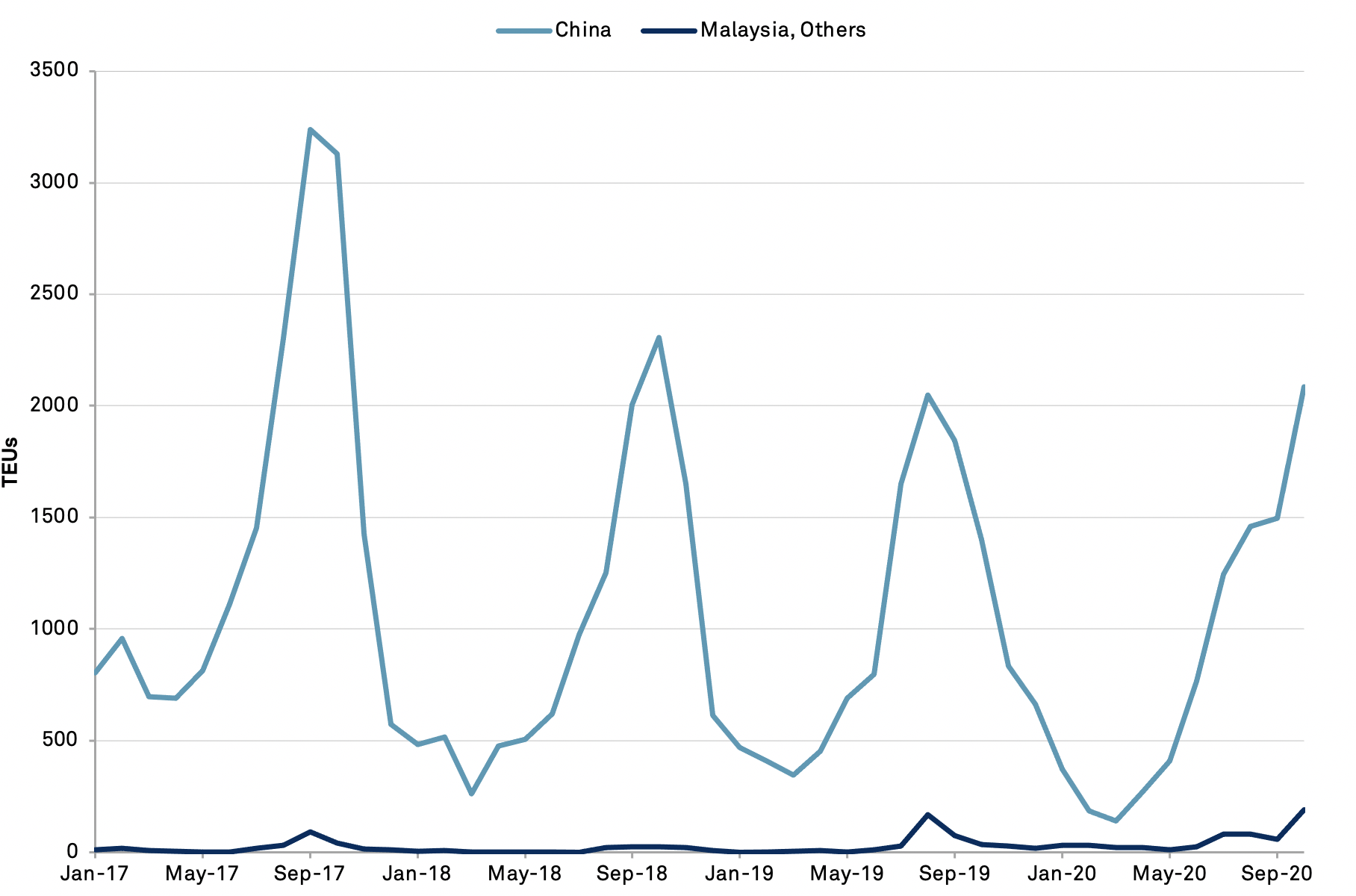 The core toy line does not currently have to pay additional duties. The firm has a marginal risk emerging during the remainder of the Trump administration, as outlined in Panjiva’s Nov. 9 research, should the Trump administration pursue a scorched-earth policy. In any event the incoming Biden administration has an avowedly hawkish stance with regards to China and may not remove the tariffs in the near future.
