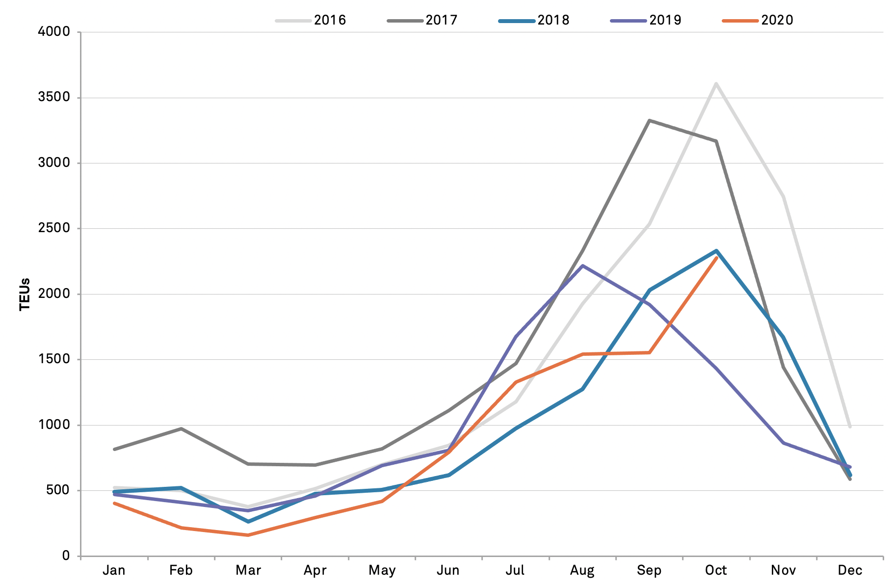 Panjiva’s data shows that U.S. seaborne imports linked to the firm, which are highly seasonal due to the predominance of electronic toys in the company’s product mix, had dropped by 23.9% year over year in Q3’20. There’s subsequently been a recovery with a 58.7% surge in October, perhaps indicating late stocking for the holiday season as well as rebuilding inventories in the toy segment.