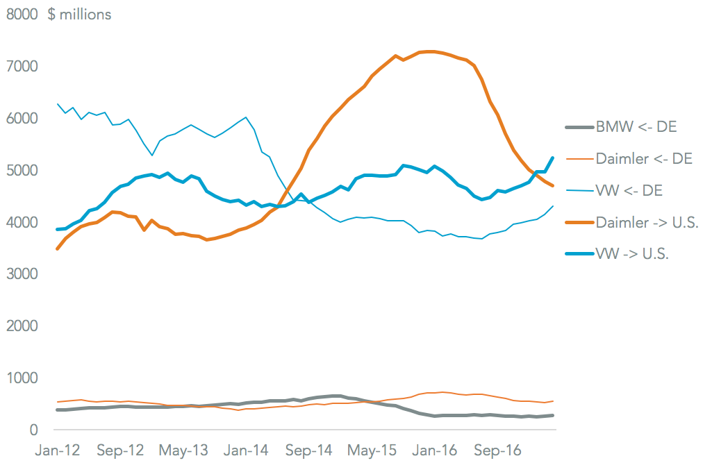 Further discussions in autos may also center around relations with the United States. As well as Volkswagen – which exports $5.24 billion of goods to the U.S. from Mexico – Daimler also produces in Mexico for onward shipment to the U.S. That makes them vulnerable to the renegotiation of NAFTA (via rules of origin) and a border-adjustable tax.