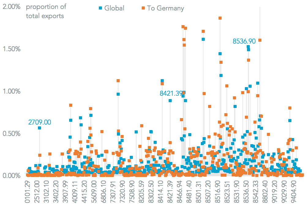 Autos aren’t the only area for discussion however. Panjiva analysis of Mexico’s top 500 exports globally vs. those exported to Germany shows the largest opportunities for expansion outside autos include power distribution equipment and refined oil products.