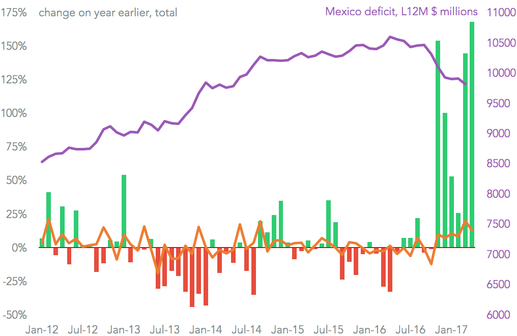 Germany is Mexico’s seventh biggest import supplier but only its 13th largest export market, Panjiva data shows. Mexico will be keen to increase its exports to Germany – despite a 50.0% increase in the 12 months to April 30 it still has an annual trade deficit of $9.8 billion.