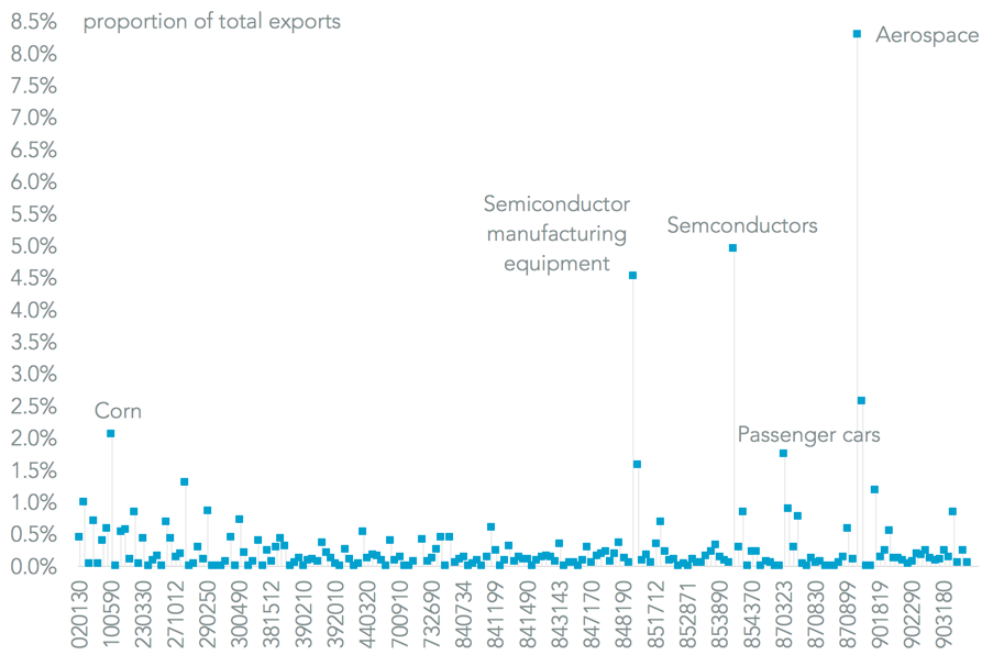 The largest U.S. export lines to South Korea, against which tariffs could be applied, include civilian aerospace ($3.5 billion of annual exports), semiconductors ($2.1 billion), machines for manufacturing semiconductors ($1.9 billion), corn ($870 million) and passenger vehicles ($740 million).