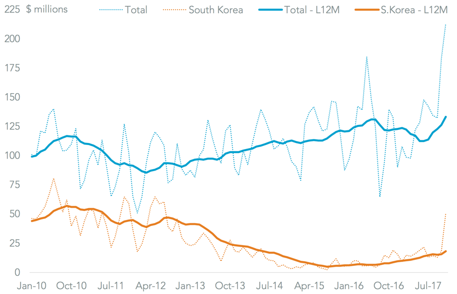 Panjiva data shows South Korean exports of large residential washing machines fell from a peak of $673 million in the 12 months to October 2010 to a trough of $80 million as at July 2016. They have since recovered, likely as manufacturers seek to build inventories ahead of the January 23 2018 tariff decision.