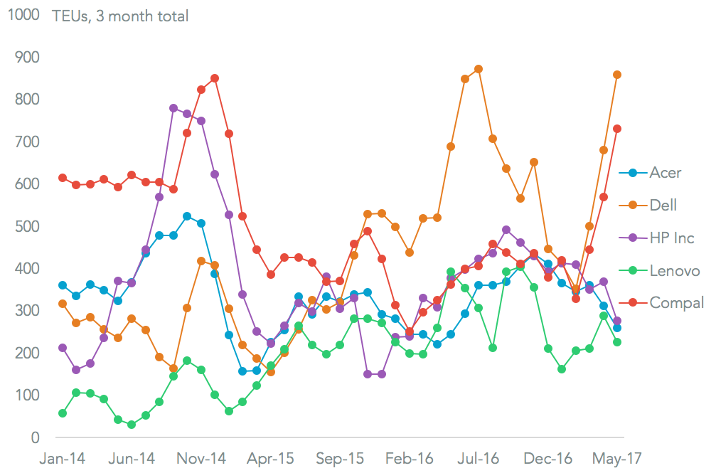 Acer may have passed its best, with a 38.9% drop in units imported by sea on a year earlier in May bringing its quarterly average to just 6.6% higher than a year before. Not all manufacturers are suffering however. Seaborne laptop imports associated with Dell climbed to their highest since May 2016 after climbing 12.6%. That left the quarterly rolling total 24.9% higher than a year prior. Among the original design manufacturers (ODMs) Compal has performed the best with shipments rising 102% on a year earlier in the past three months.