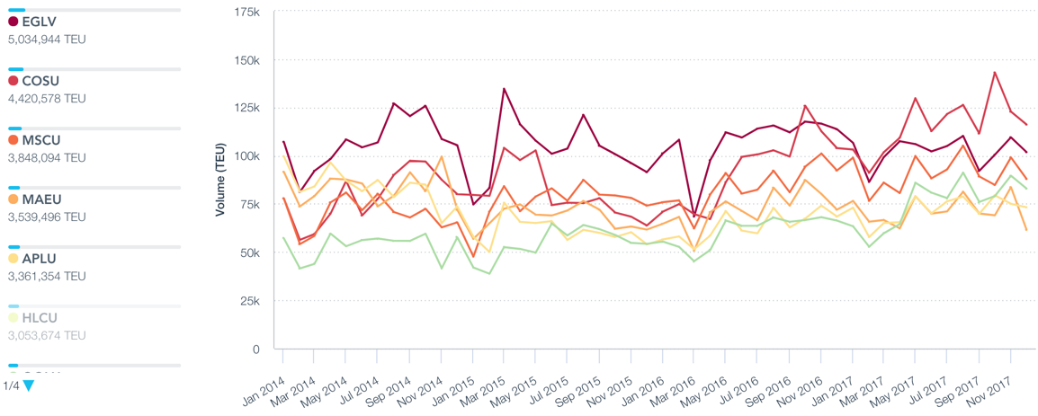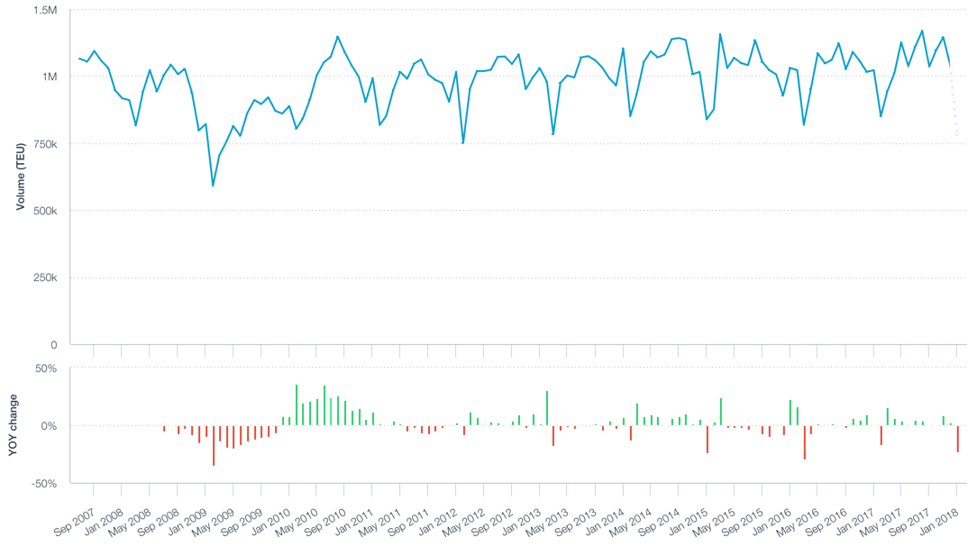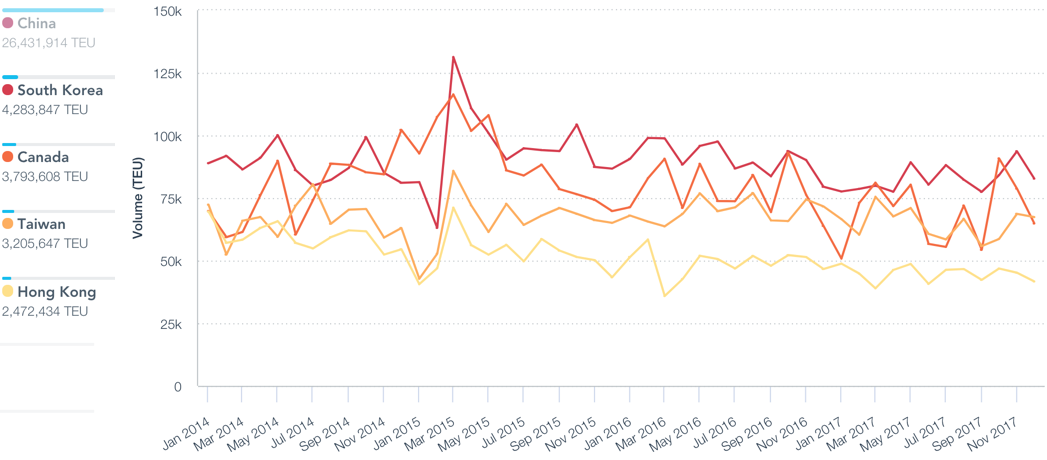 Container handling at the top five west coast U.S. seaports (LA, Long Beach, Oakland, Seattle and Tacoma) climbed 6.3% on a year earlier in 2017, Panjiva analysis of official port data shows. That was led by Long Beach which gained market share in incoming Chinese traffic from neighboring Los Angeles, as outlined in Panjiva research of January 24.The Puget Sound ports only expanded by 1.6%, potentially due to a loss of market share to more northerly ports in Canada, as well as internal disruption from terminal lease changes.