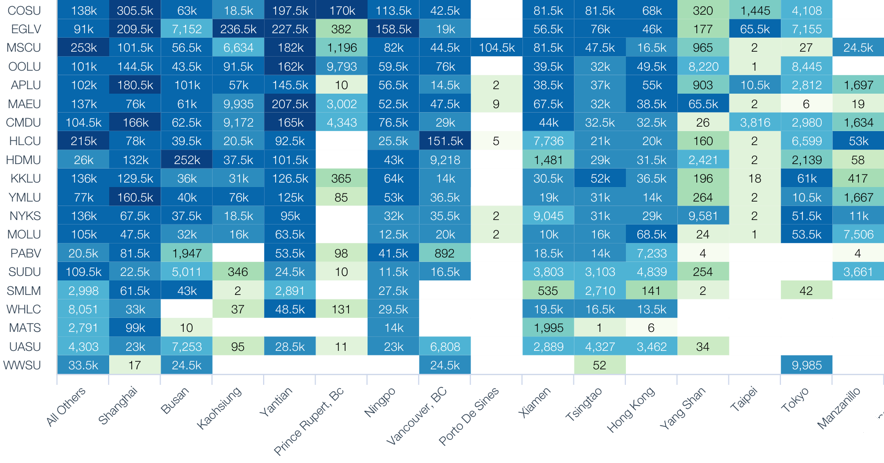The most significant service was COSCO’s shipments from Shanghai with an aggregate 305,500 TEUs handled, which was 1.2x the next biggest – Hyundai Merchant Marine’s 252,000 TEUs from Busan. The largest non-Asian services include COSCO’s from Prince Rupert, Hapag-Lloyd from Vancouver and MSC from Sines.
