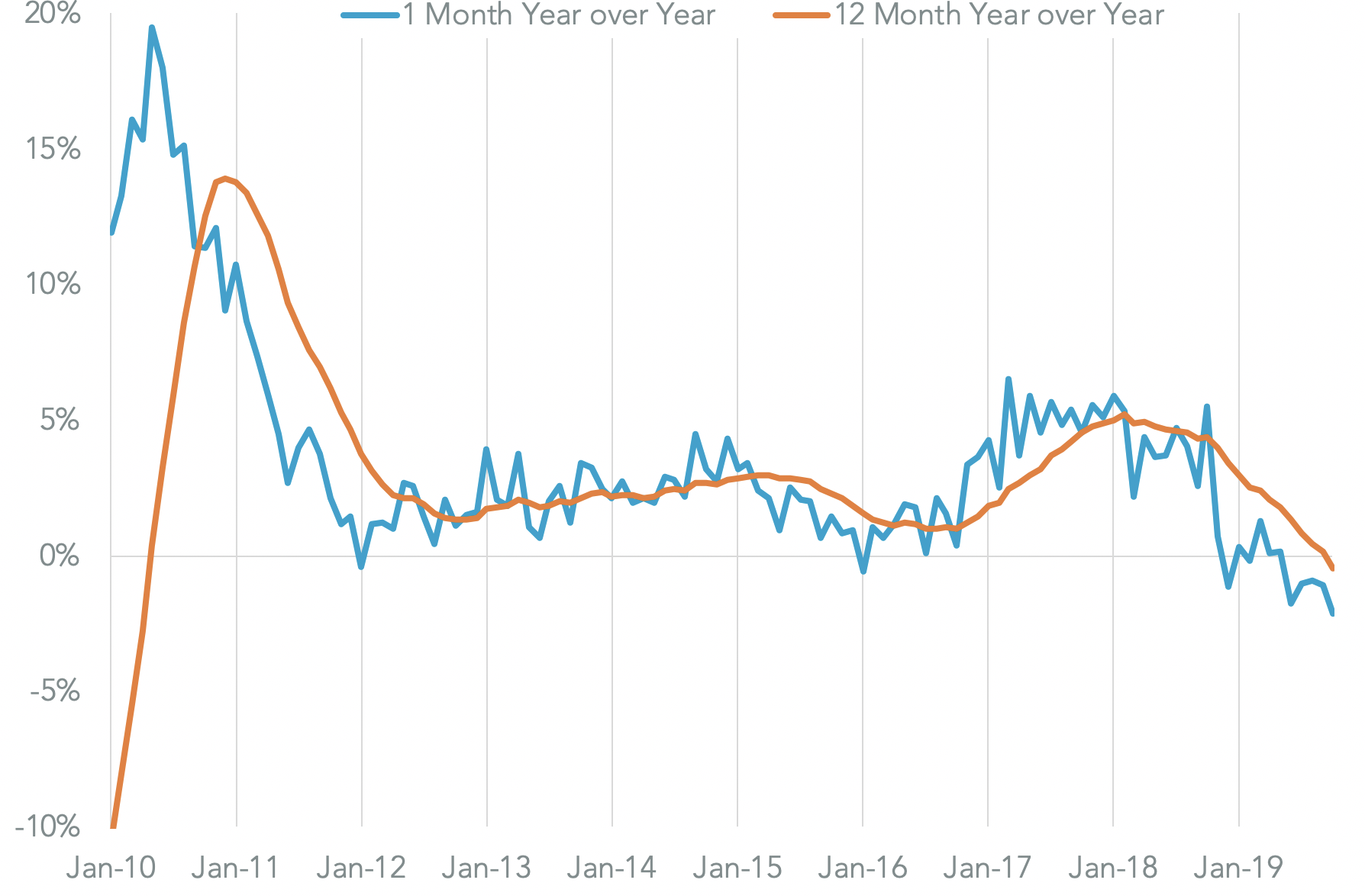 Tariff-driven attempts to boost trade come after a parlous year for international trade activity. Global trade activity fell by 2.1% year over year in October, Panjiva’s analysis of CPB World Monitor data shows. That marked the fourth straight month of decline and meant the 12 month average of a 0.5% decline was the first annualized drop on that basis since April 2010.