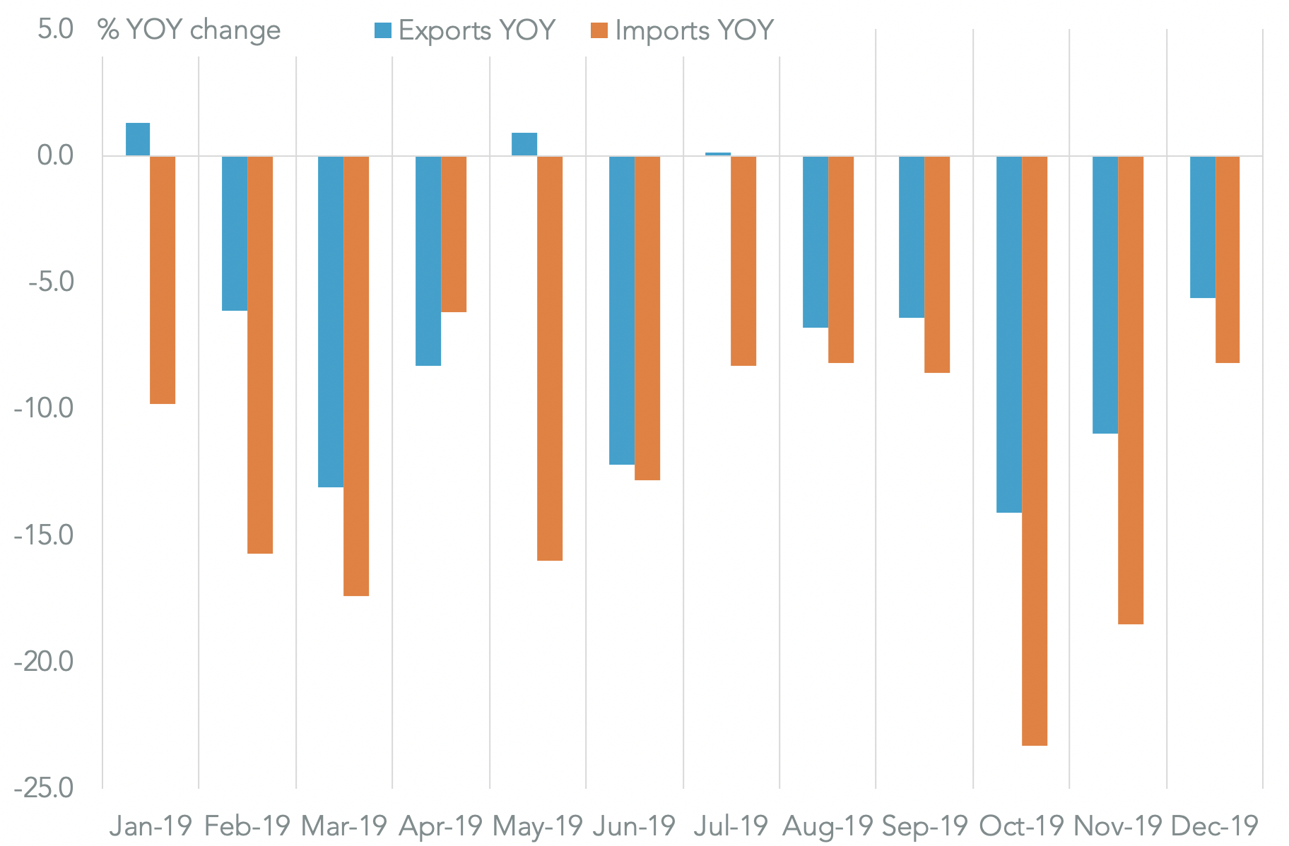 Similarly, exports from South Korea, typically the first country to report monthly data, fell by 5.2% year over year in December, Panjiva’s analysis of official data shows. That was the slowest rate of decline since April and the slowest since December 2018 when excluding the volatile shipping industry with a 1.4% decline. Yet, it still marks the 13th straight month of falling exports.