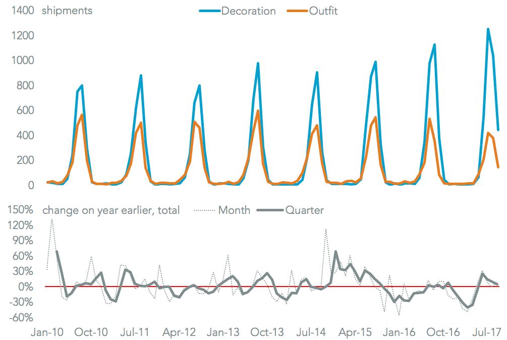 That’s likely the result of a passing in the height of interest in all-things zombie following a series of hit TV shows in 2015. Since then imports have fallen 26.8% while staples such as vampire (unchanged) and wizard (up 1.5%) outfits have been more stable. The excellent news is that we are already past “ peak clown” despite this summer’s highly successful “It” movie, with a 38.8% slump.