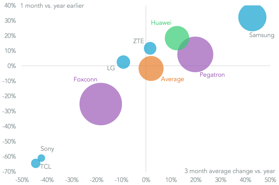 That likely reflects, in part, the two-stage release of Apple’s latest iPhone update with the 8-series becoming available on September 22 and the X-line only having been released on November 3. U.S. shipments have been slightly healthier than average, having increased by 2.5% in September and by 6.0% in the quarter.